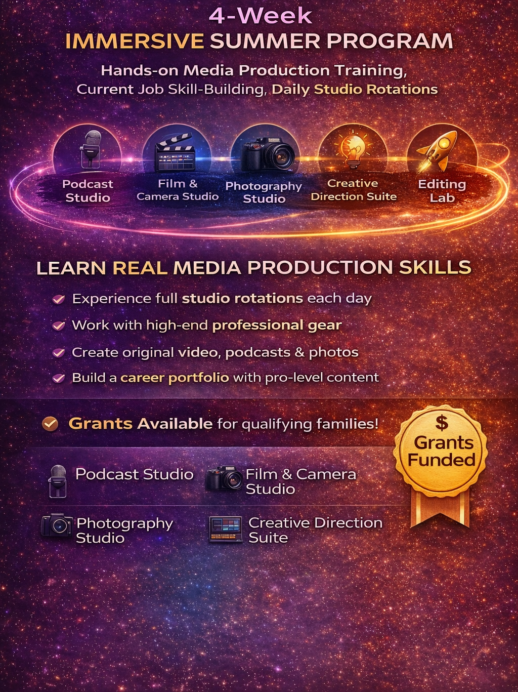 We are a nonprofit creative career training program for middle and high school students in metro Atlanta. Based in a 7,000 sq. ft. commercial studio and led by professional mentors, we give students real tools, real experience, and real access to the booming media industries of Georgia.